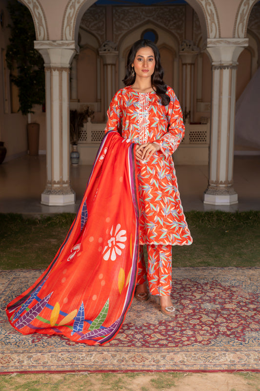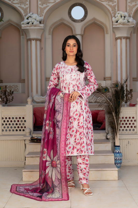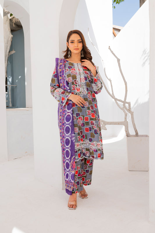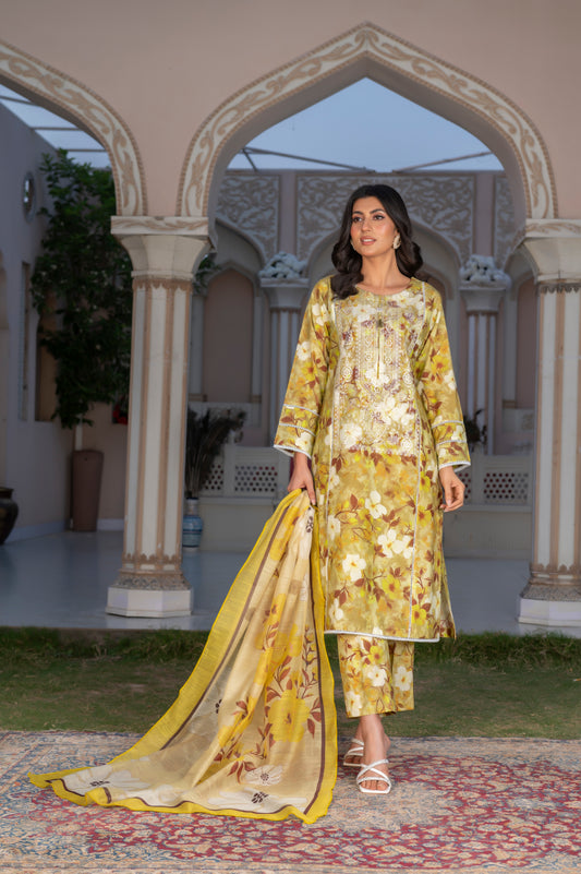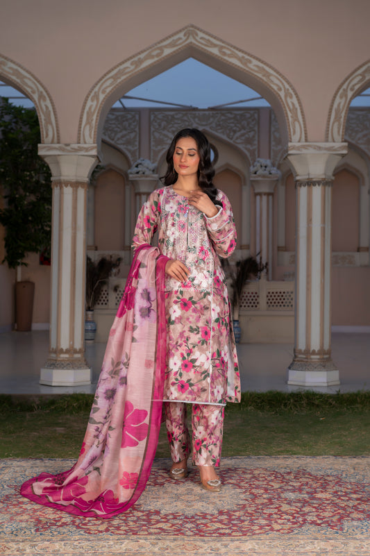 Shirt (Lawn Fabric): Digitally printed front and back with soft motifs Machine embroidery on the...