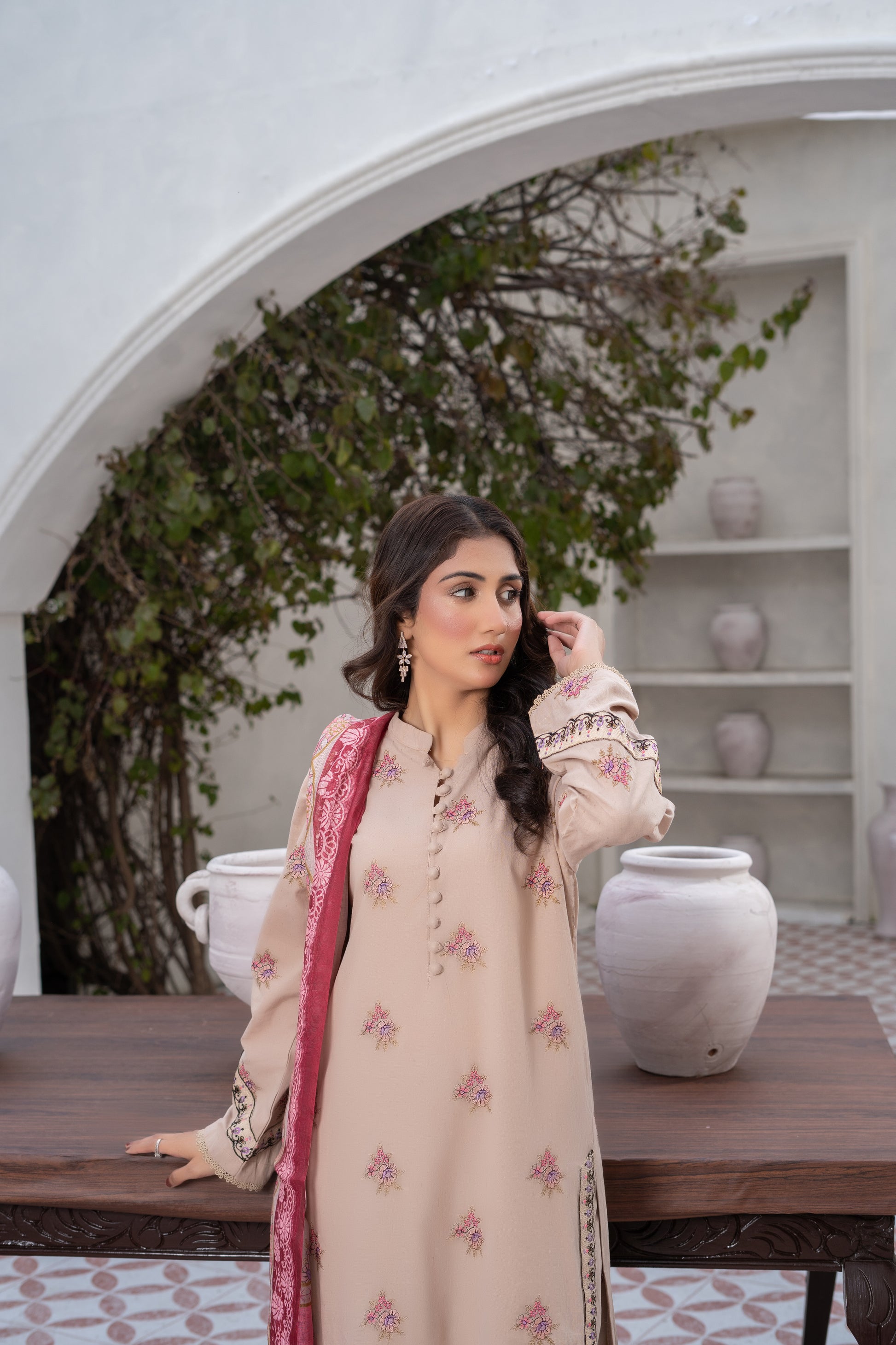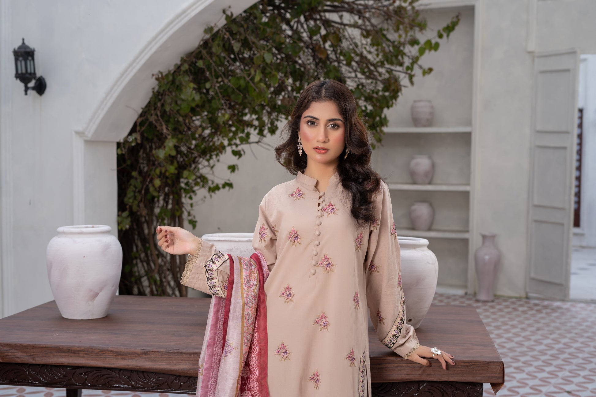 Front: Embroidered with intricate Motifsi floral vines across the neckline and sleeves