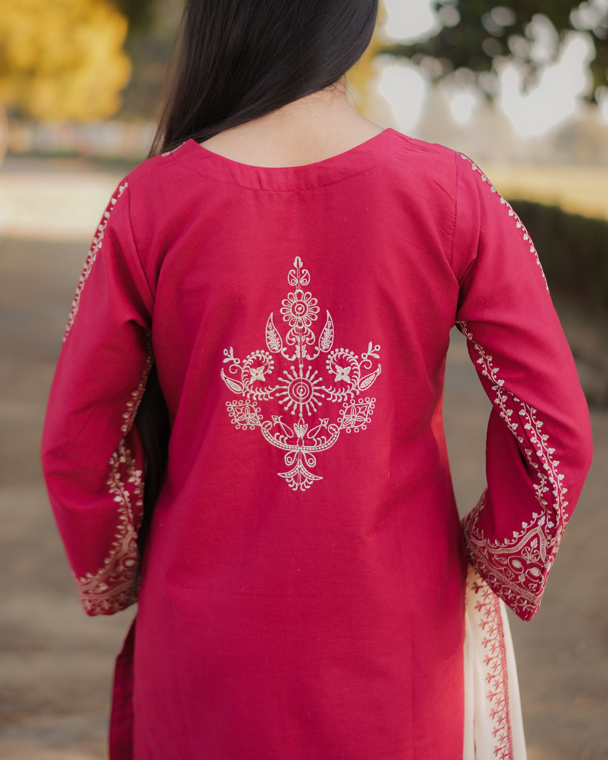 Front: Embroidered with intricate motif's floral vines across the neckline and sleeves